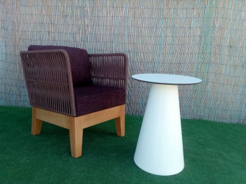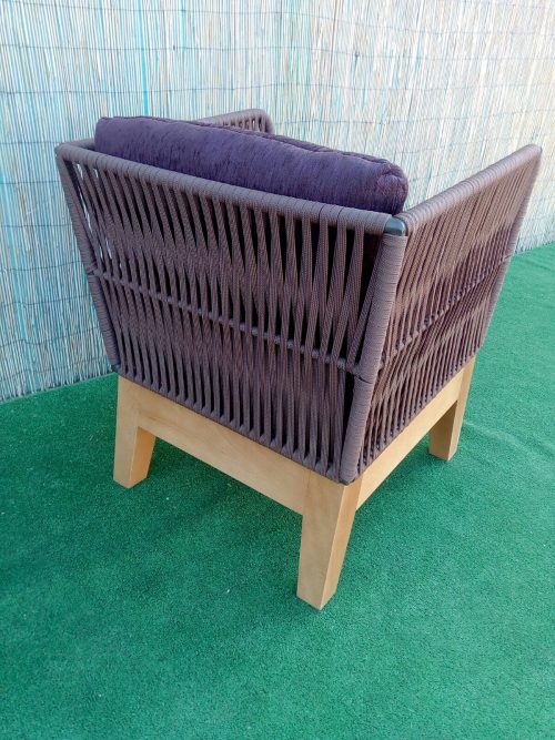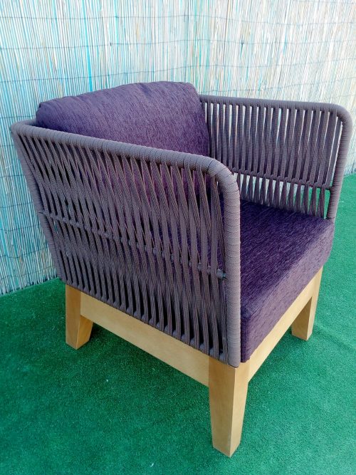 Butaca madera trenzada. Esta butaca está fabricada con base de madera de cuatro patas teñido y cuerpo metálico pintado en epoxi trenzado con cuerda plana de poliester.