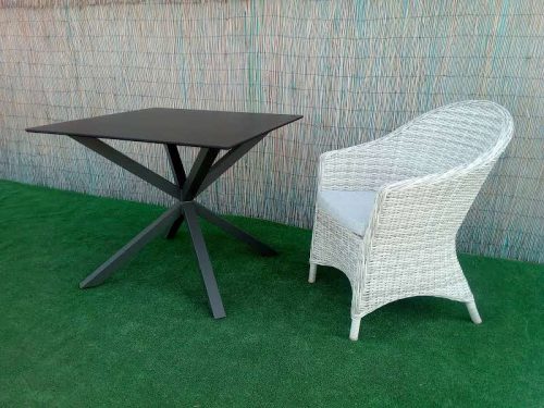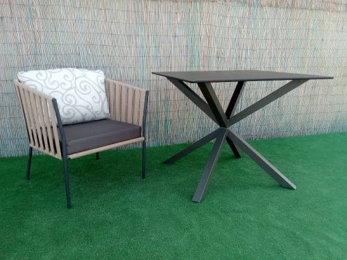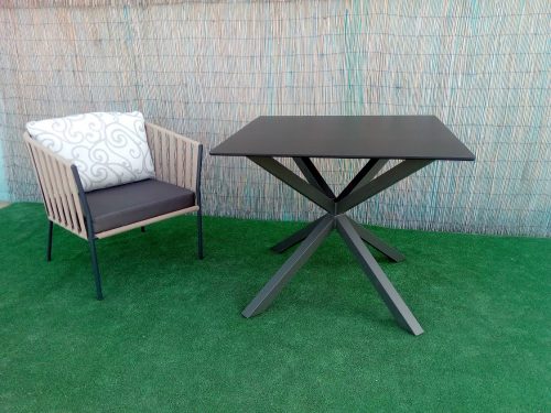 Mesa cuadrada cruz metal con estructura de acero tubo cuadrado de cuatro patas pintadas en epoxi y tablero compacto redondo admite hasta 120×120.